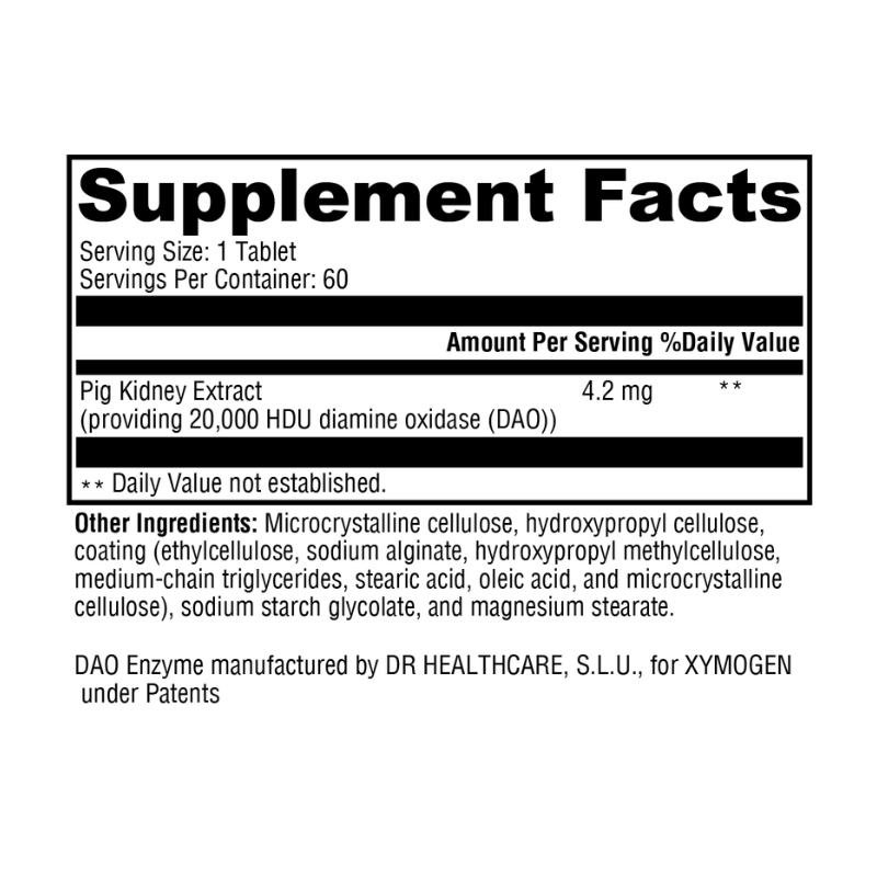 HistoDAO™ is a patented enzyme formula containing diamine oxidase (DAO)—the main enzyme responsible for the degradation of ingested histamine. This enzyme has been clinically tested and found to break down food-derived histamine in the digestive tract. DAO is not absorbed and does not have systemic activity. HistDAO does not manage or address antibody-related or IgE-related food allergies.